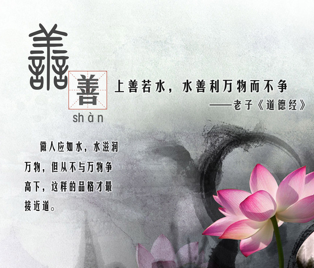 《道德经》提出上善若水、居善地。这是明确的风水学内容。“上善若水”也明显是风水宝地条件之重点。美之为美、善之为善。讲风水善恶的辩证内涵。道者同于道、德者同于德和地得一以宁讲风水的哲学基础是阴阳五行学说和天人合一的观念,方法来源是六爻和八卦,并结合天干地支和九星运用于实践中。其终极目标就是要占据“藏风聚气”的风水宝地,以追求人与自然的和谐,达到天人合一的最佳风水效应,高度概括了风水哲学理论。水之柔、则莫行概括了风水的作用,强调了风水学的学习是不易的。